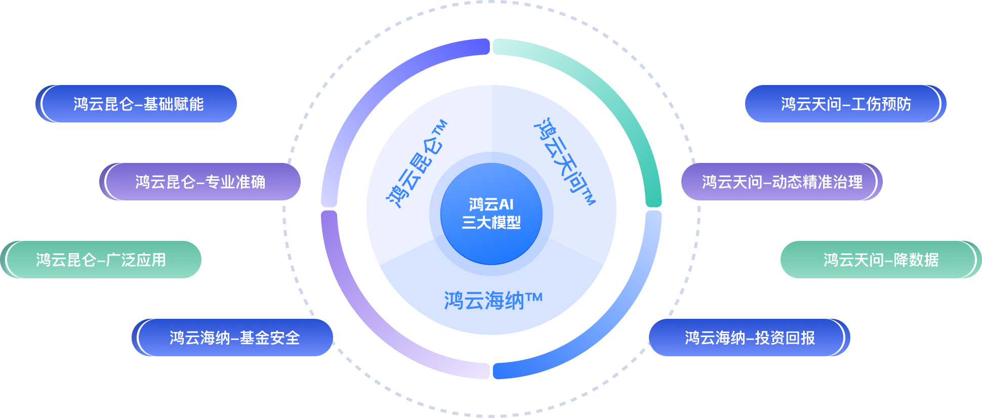 积累海量数据资源,构建结构性专业知识库,结合鸿云AI中台,训练出了40余套AI算法最终构建出三大核心模型,综合应用于各个业务场景