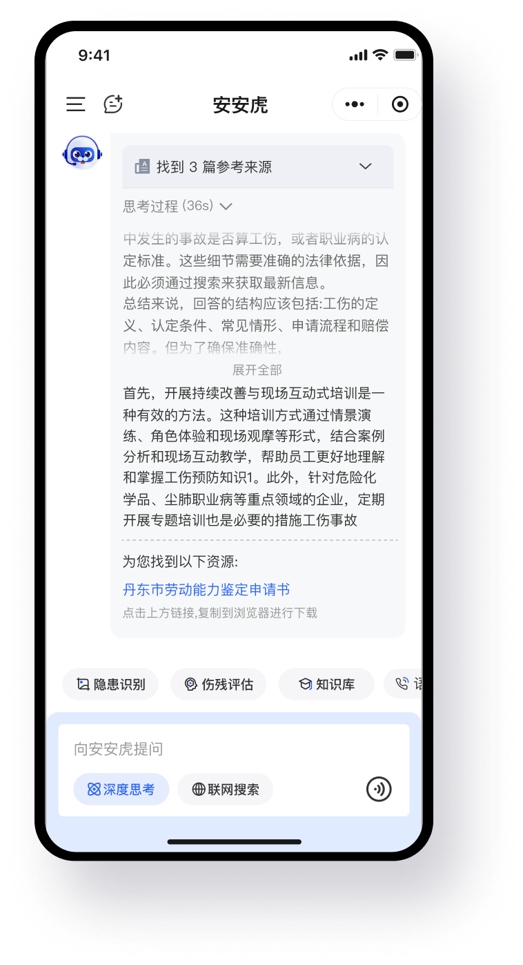 通过融合工伤相关高成熟7个AI小模型,如三伤模型、伤残等级、待遇支付等,提高回复准确率,结合工伤业务、工伤预防、法律法规综合大模型训练,并采用CPT + SFT + Agent + RAG的技术方案,丰富回复内容,提高其专业性,提供更精准的参考依据。