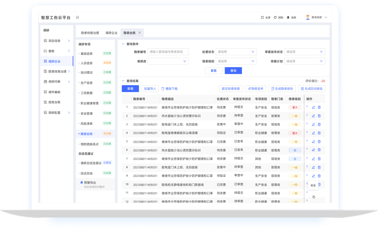 系统涵盖了从企业基本信息、安全生产管理、职业健康状况到工伤事故记录等10个维度,全方位评估企业的工伤预防现状。